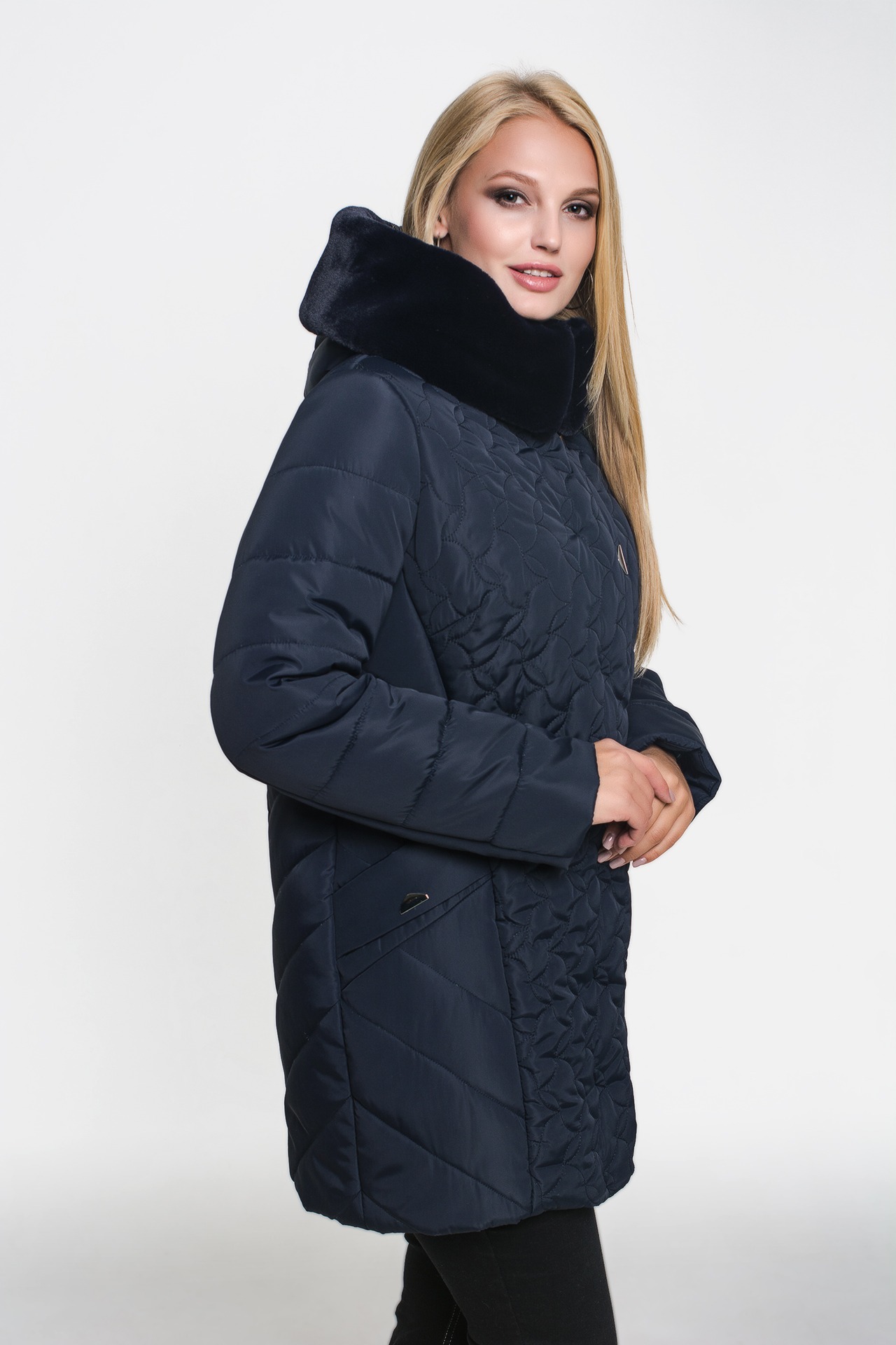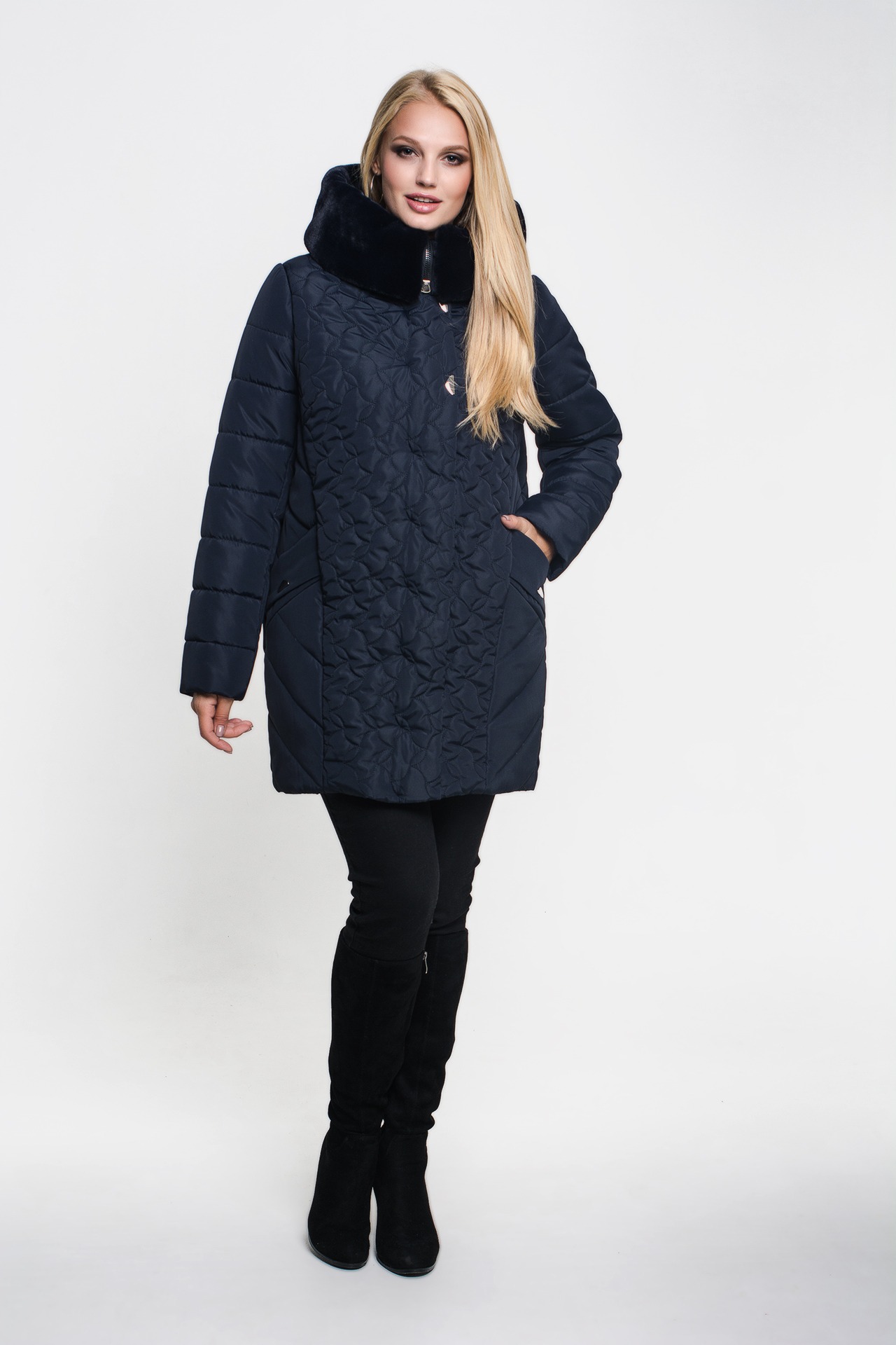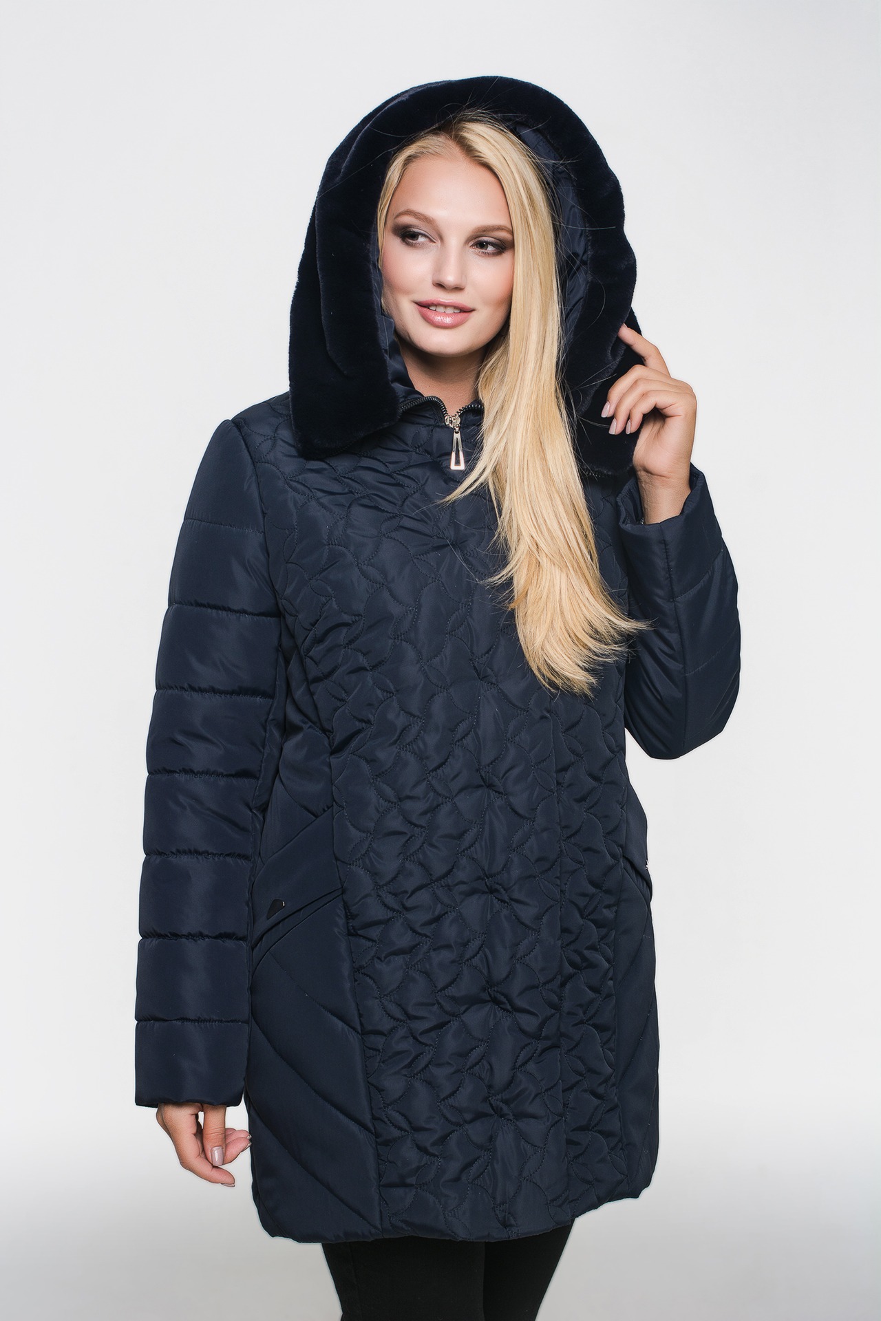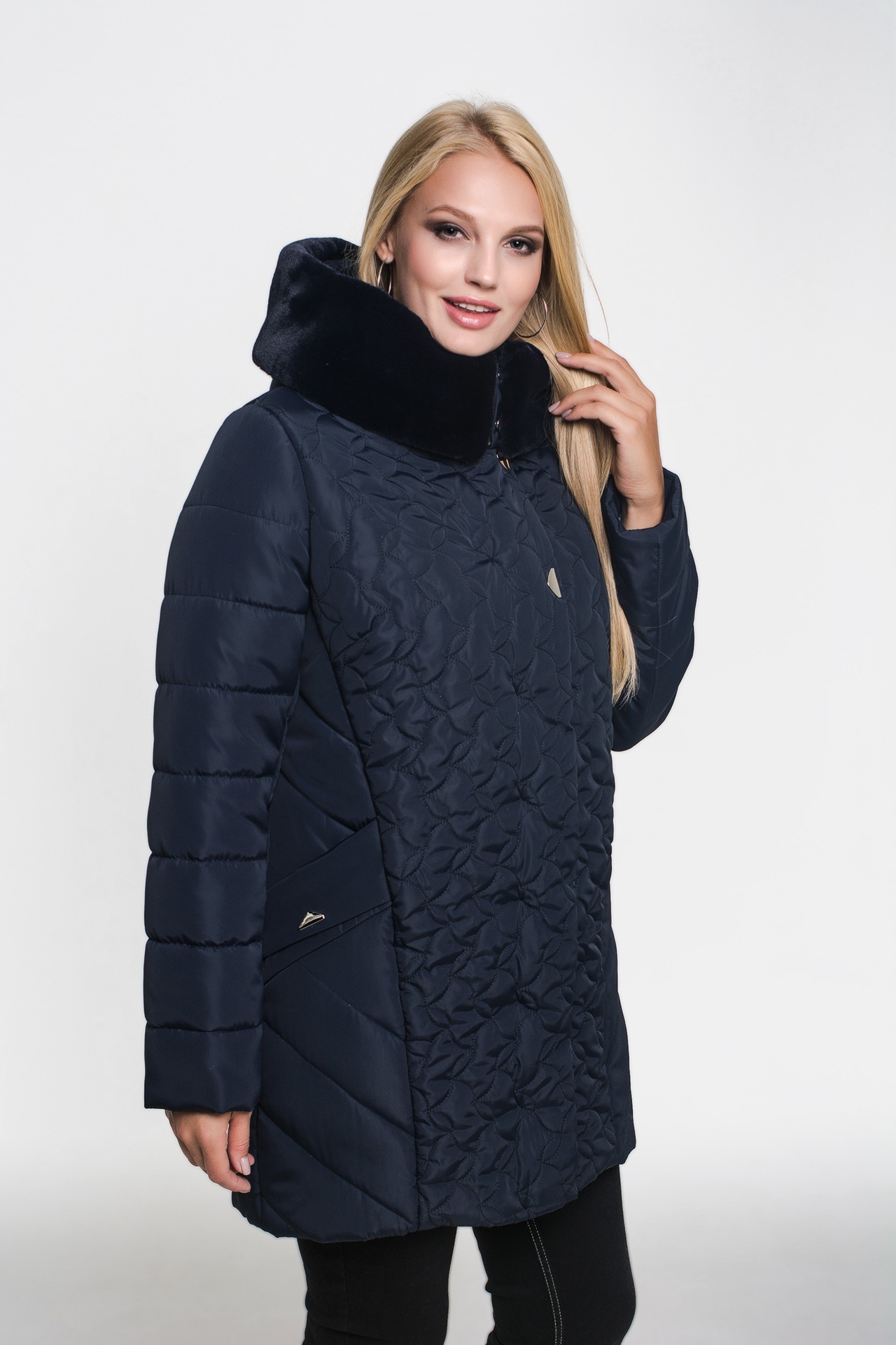 Зимняя куртка «Марта» темно-синего цвета, модель осень/зима 2019. Полуприталенная модель и объемная стежка сложной формы обеспечивают великолепную посадку и скрывают недостатки фигуры.