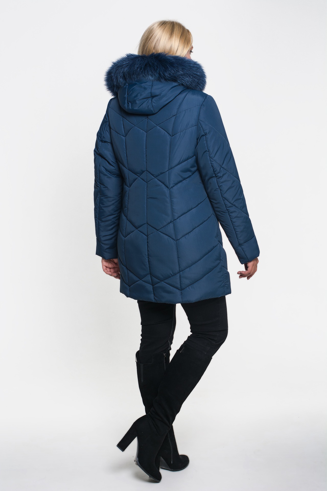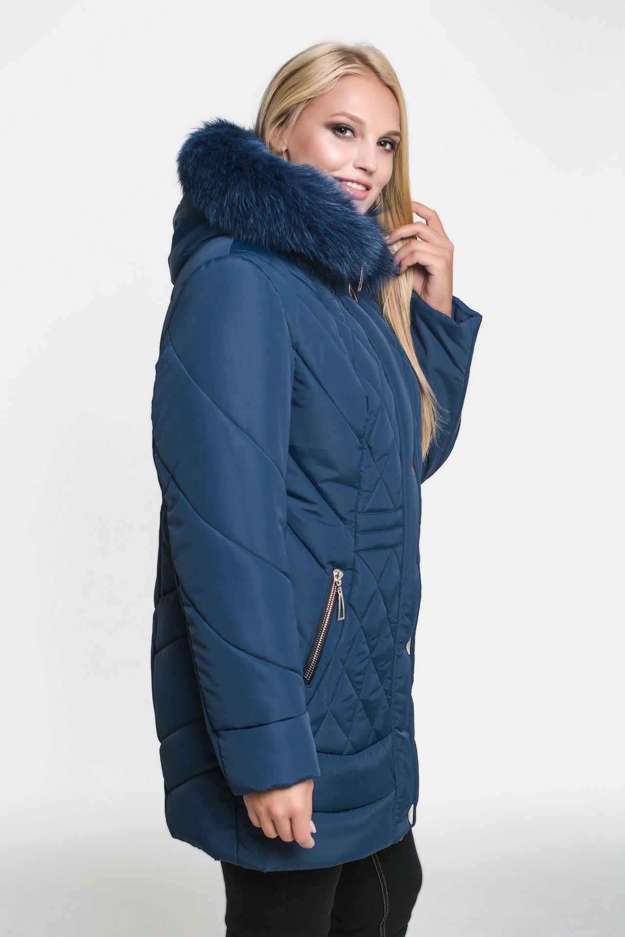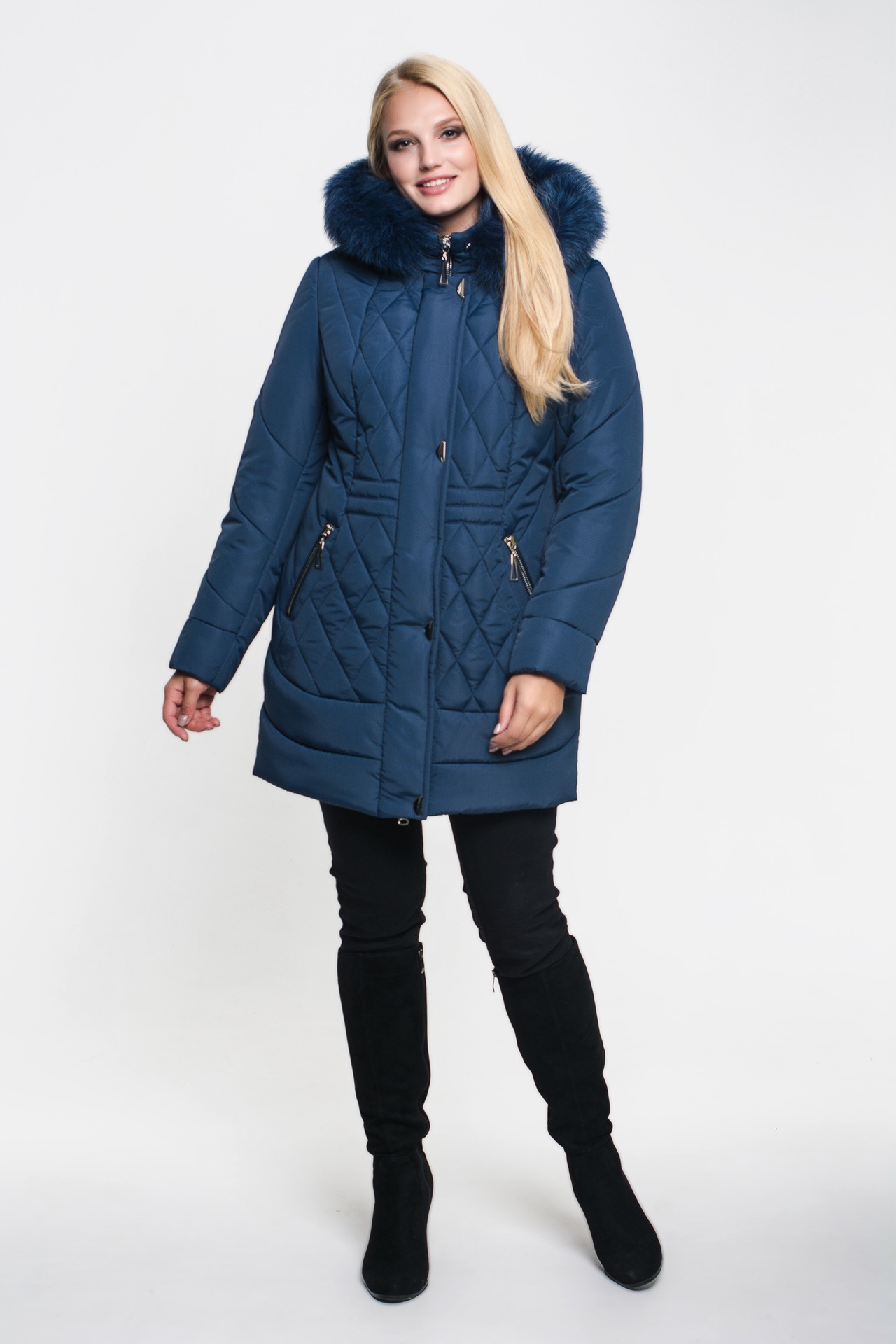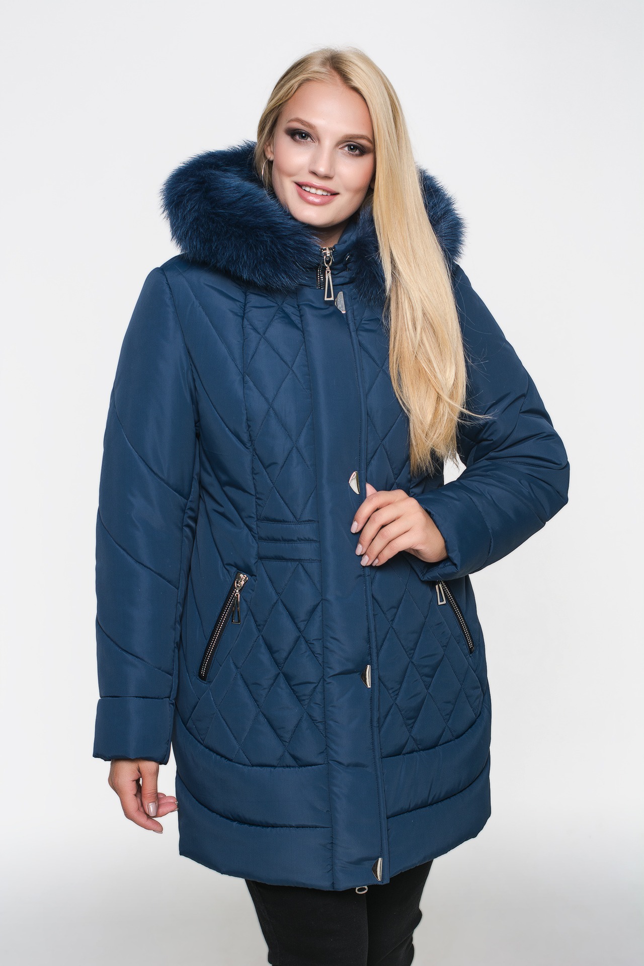 Зимняя куртка «Моника» синего цвета, модель осень/зима 2019. Полуприталенная модель и стежка сложной формы обеспечивают великолепную посадку и скрывают недостатки фигуры.