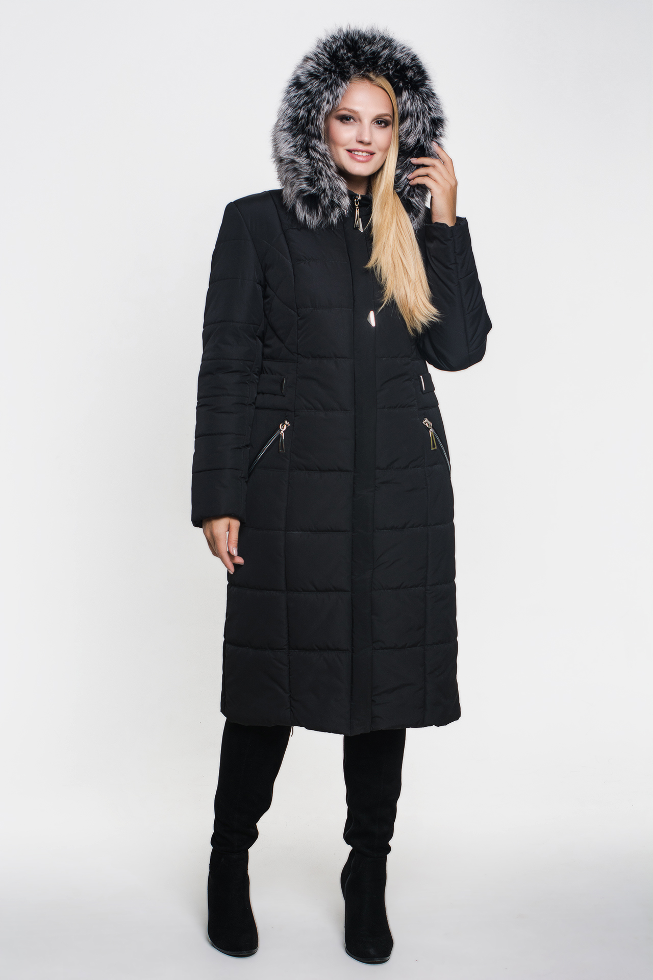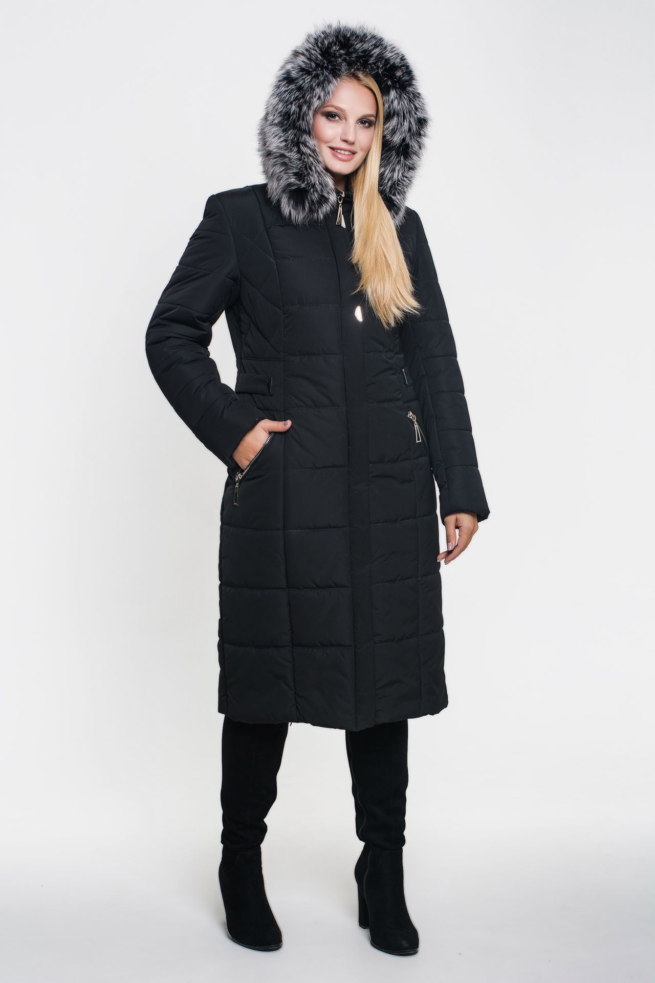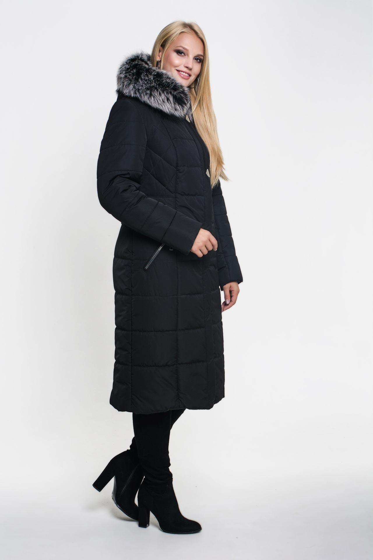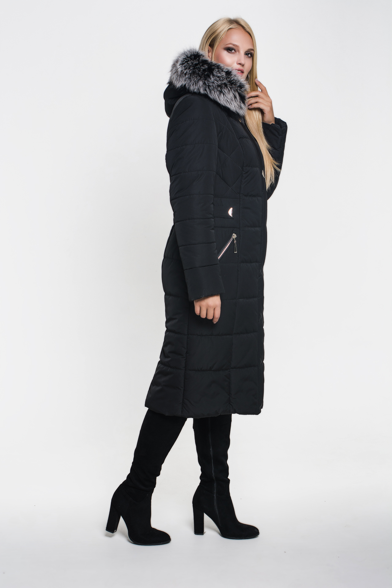 Зимнее женское стеганое пальто пуховик «Анетта» черного цвета, модель осень/зима 2019. Капюшон отделан натуральным мехом песца.