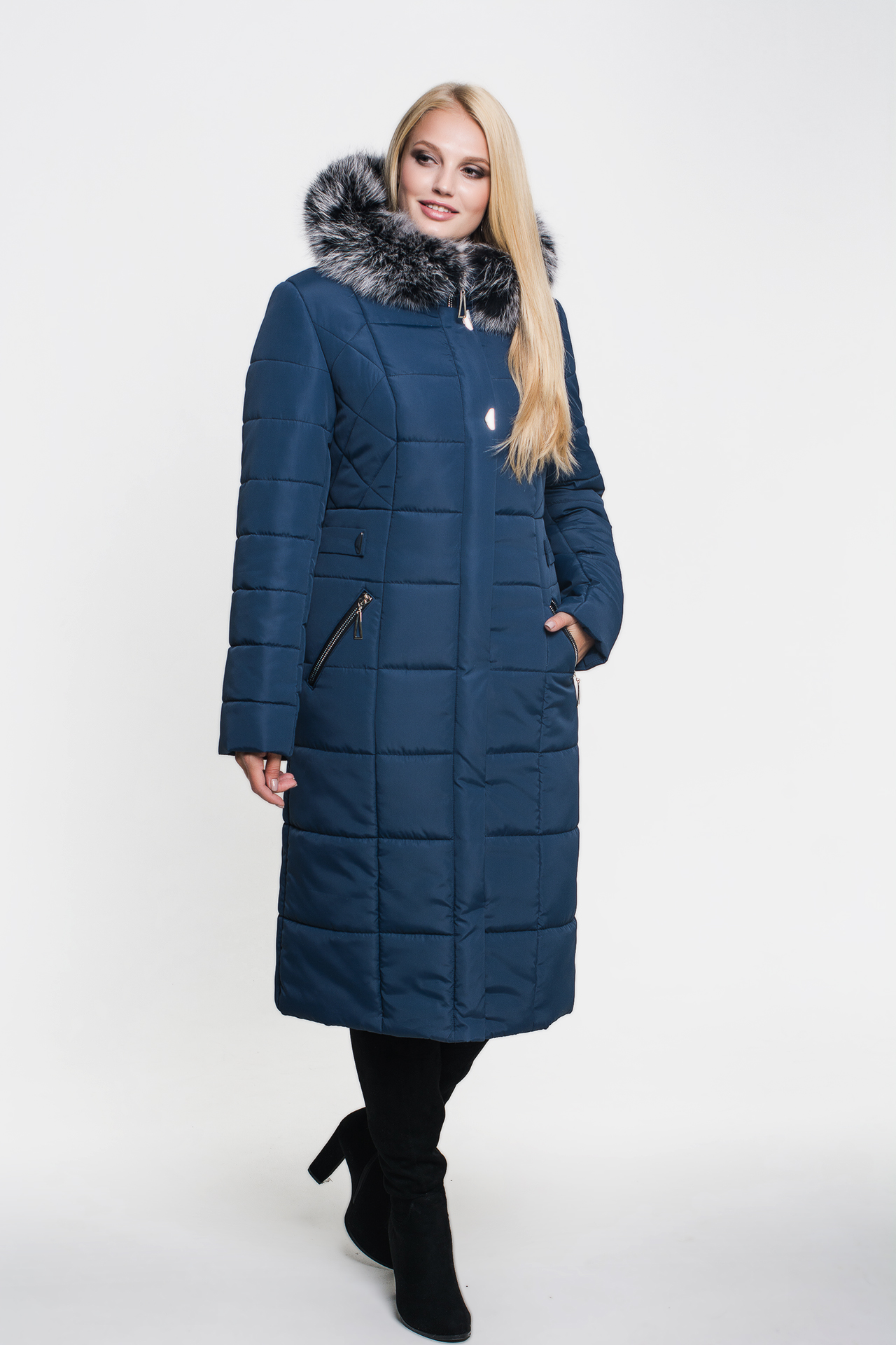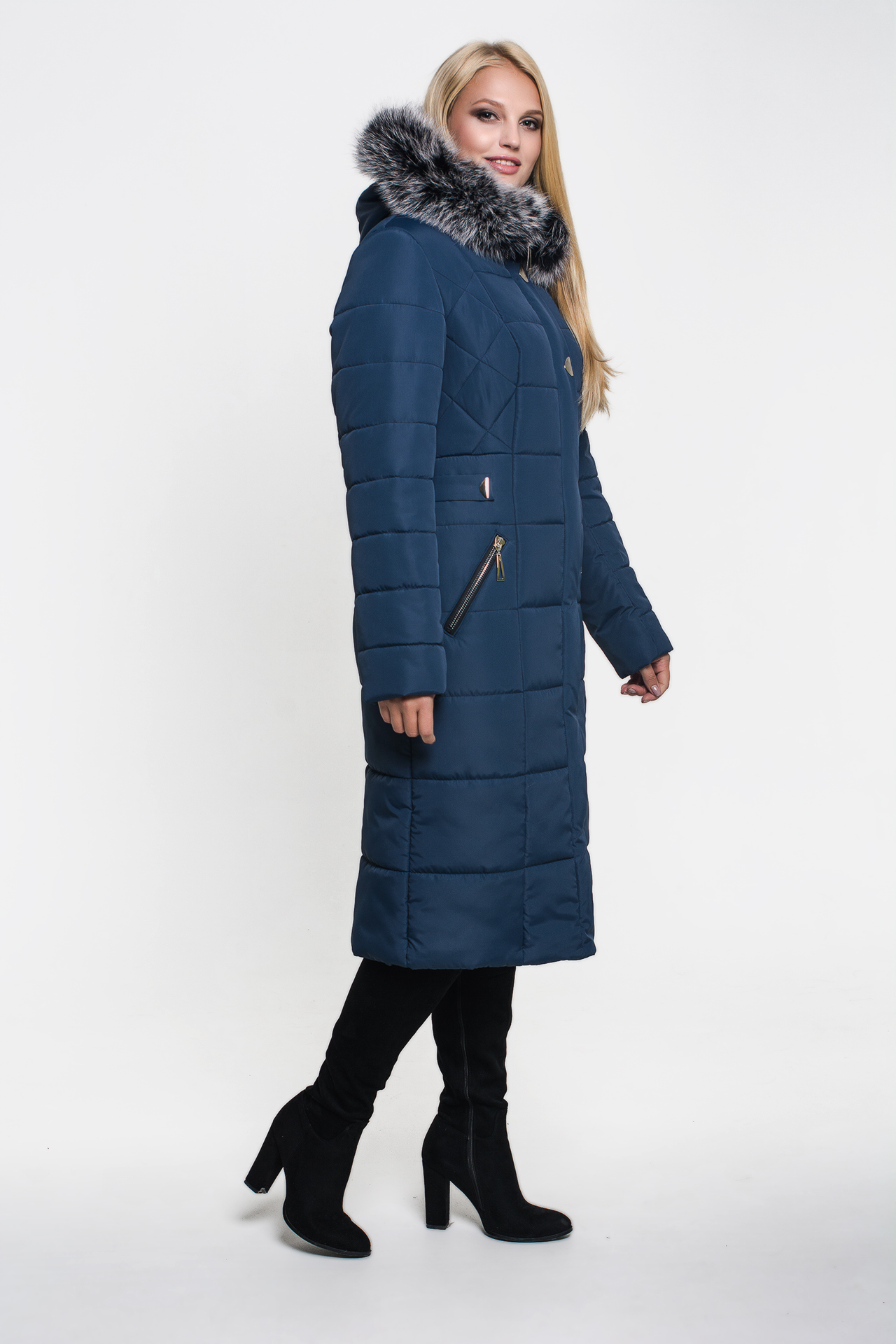 Зимнее женское стеганое пальто пуховик «Анетта» цвета “темно-синий”, модель осень/зима 2019. Капюшон отделан натуральным мехом песца.