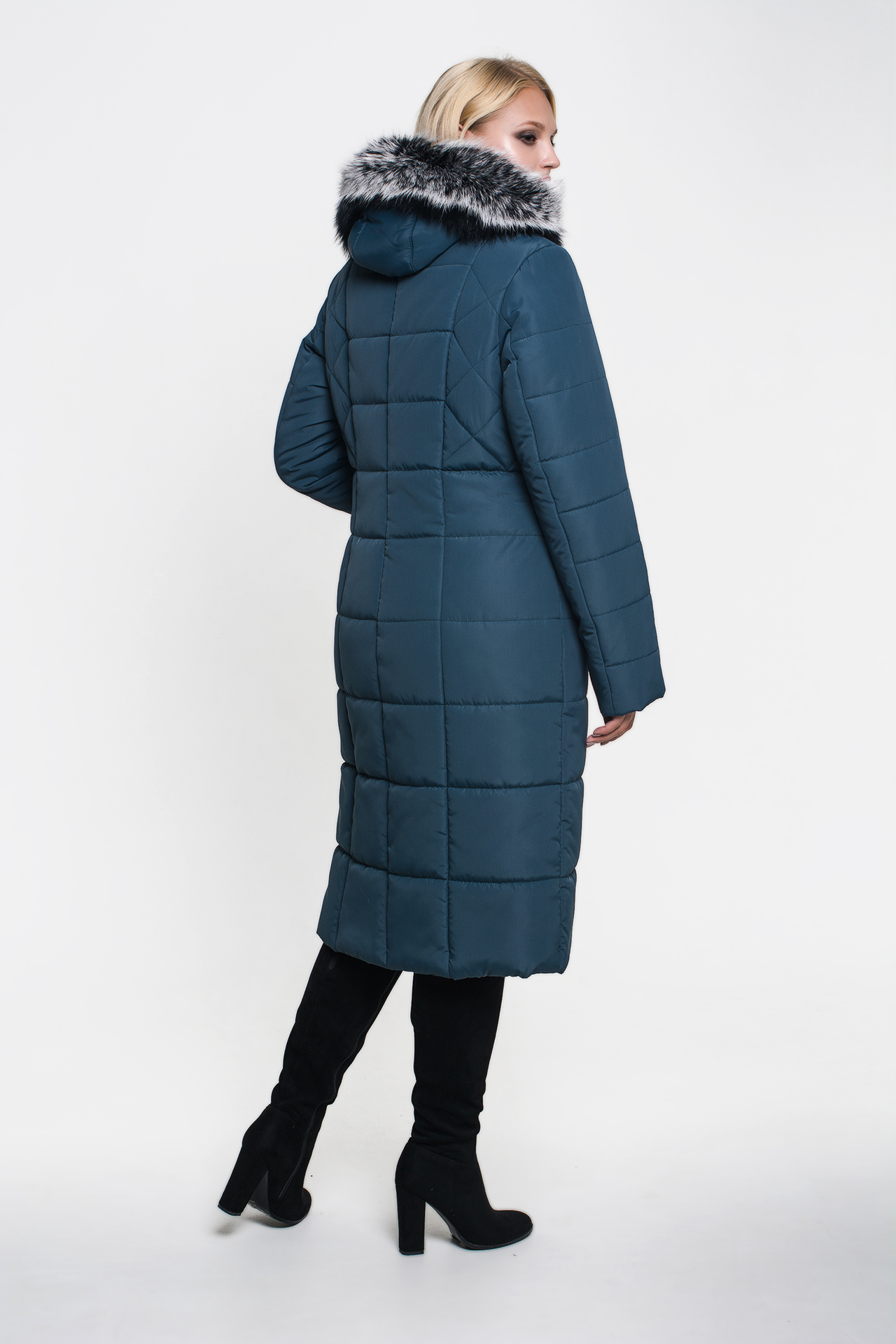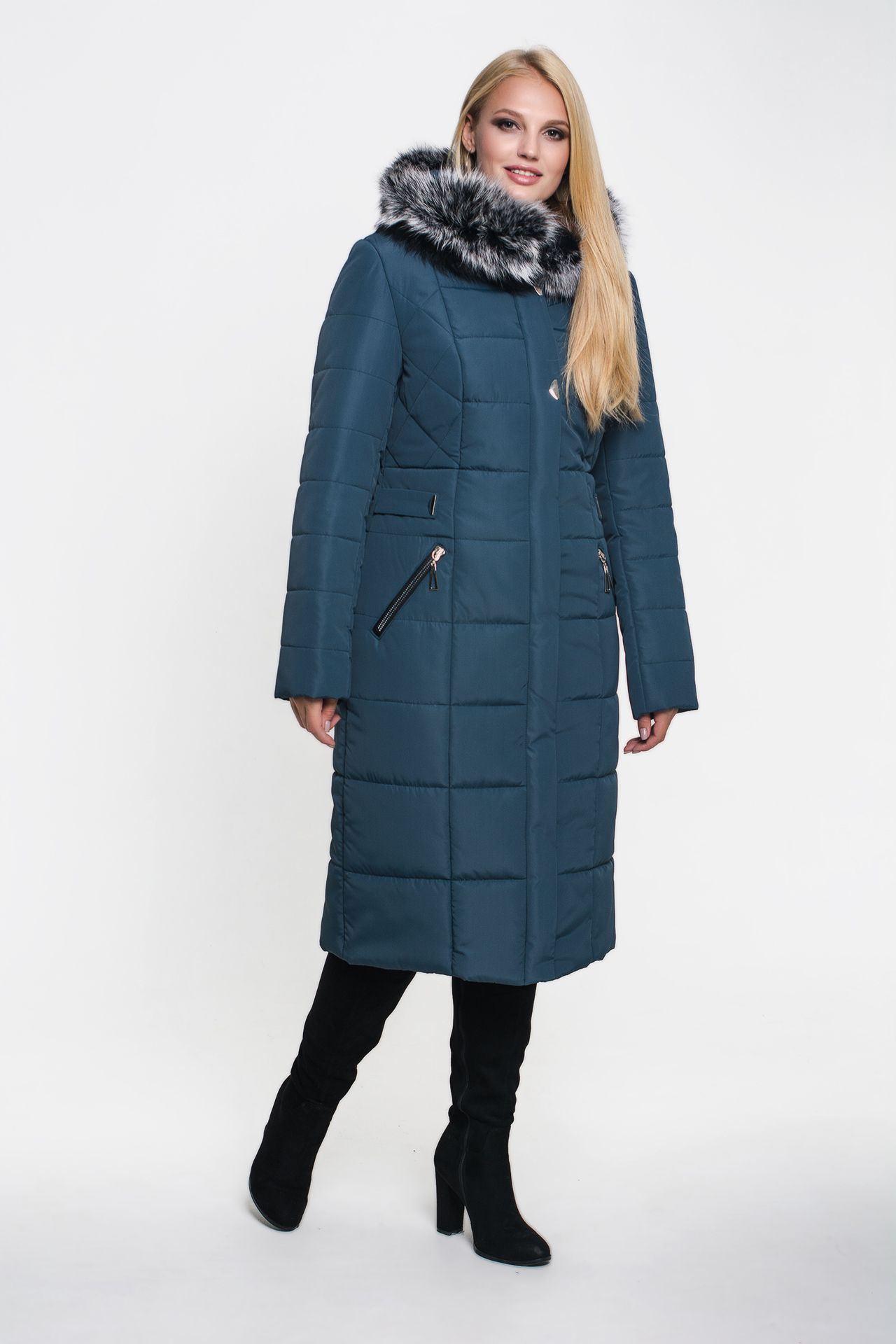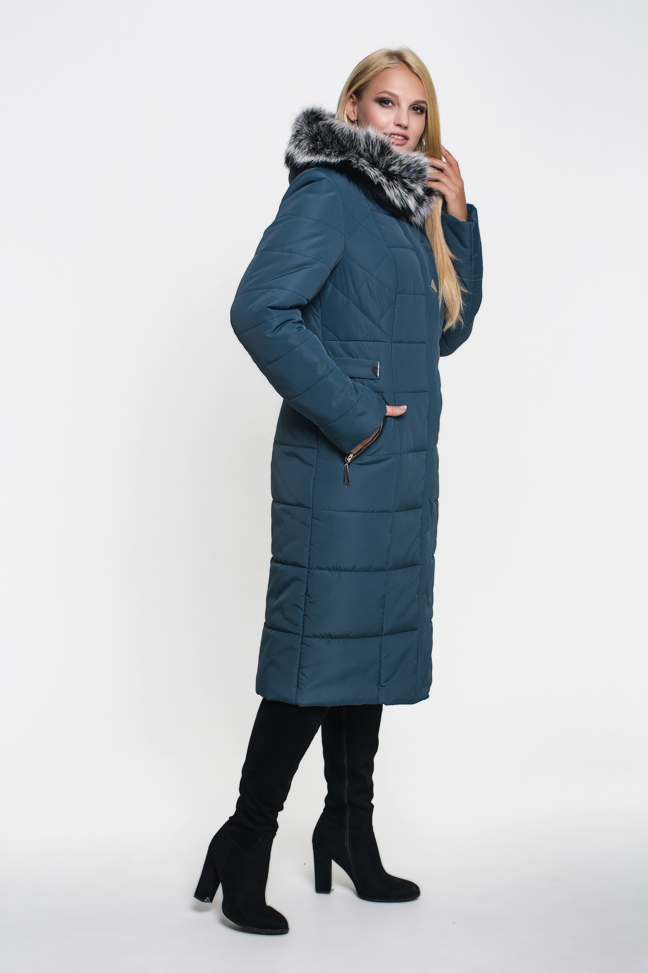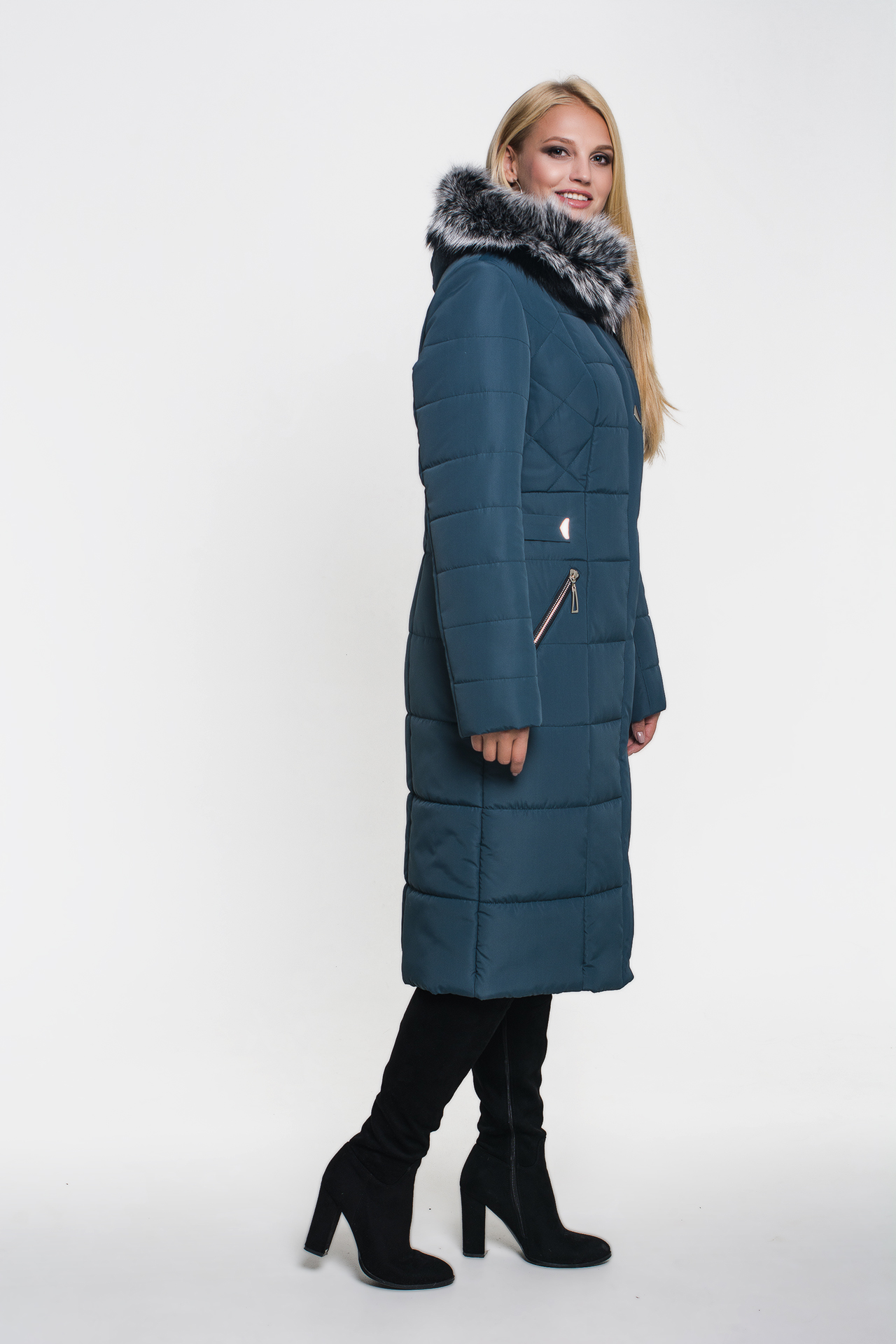 Зимнее женское стеганое пальто пуховик «Анетта» цвета “морская волна”, модель осень/зима 2019. Капюшон отделан натуральным мехом песца.